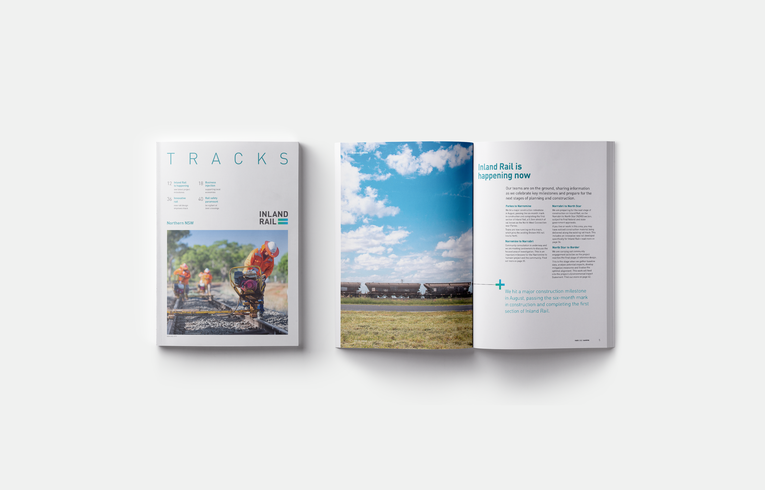 I designed Tracks magazine within the existing branding system, to frame Inland Rail as a living narrative, not a static report, via clear typography, modular grids and generous imagery.